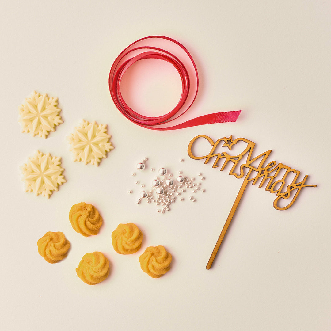 雪の結晶チョコやクッキー、アラザンなどのオーナメントを添えて、自由にデコレーションをお楽しみください。